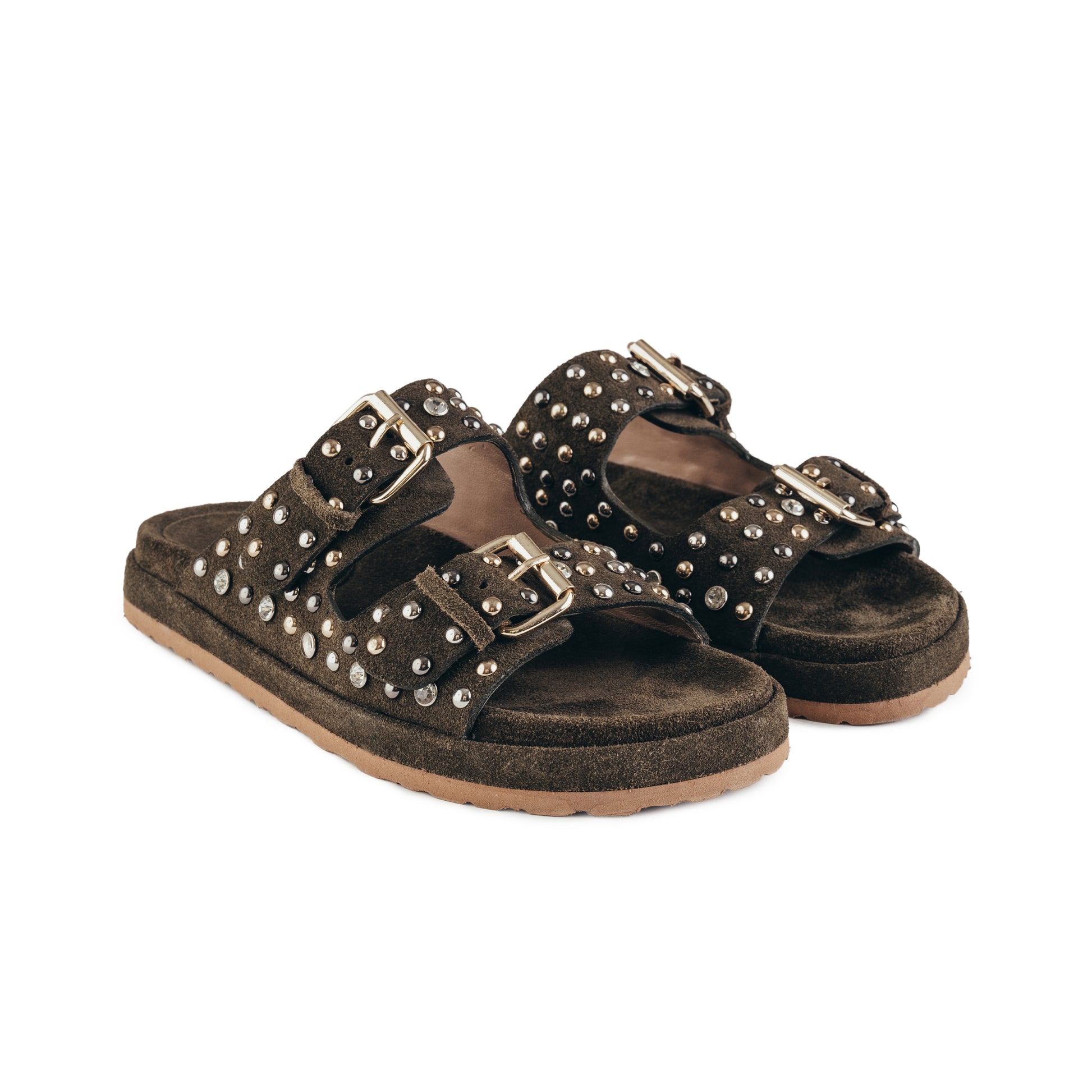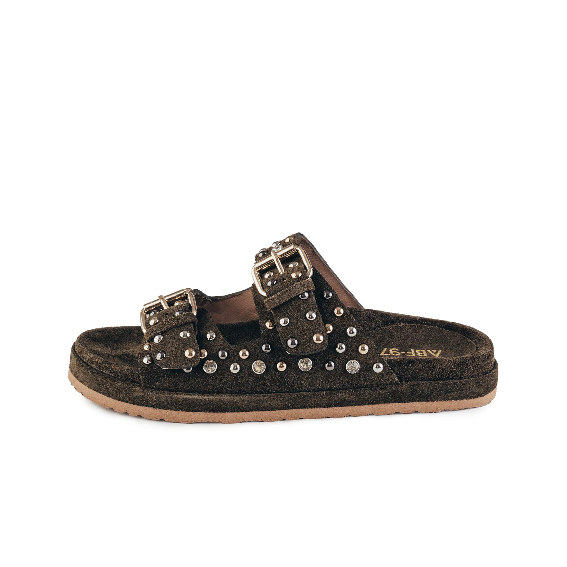 Sandálias ABF-97 com topo em camurça, brilhantes e tachas metálicas. * Cor: verde escuro. * Exterior: camurça natural . * Interior: Palmilha em camurça natural e forro em pele natural. * Sola: neolite. * Modelo: KS.24.126.
