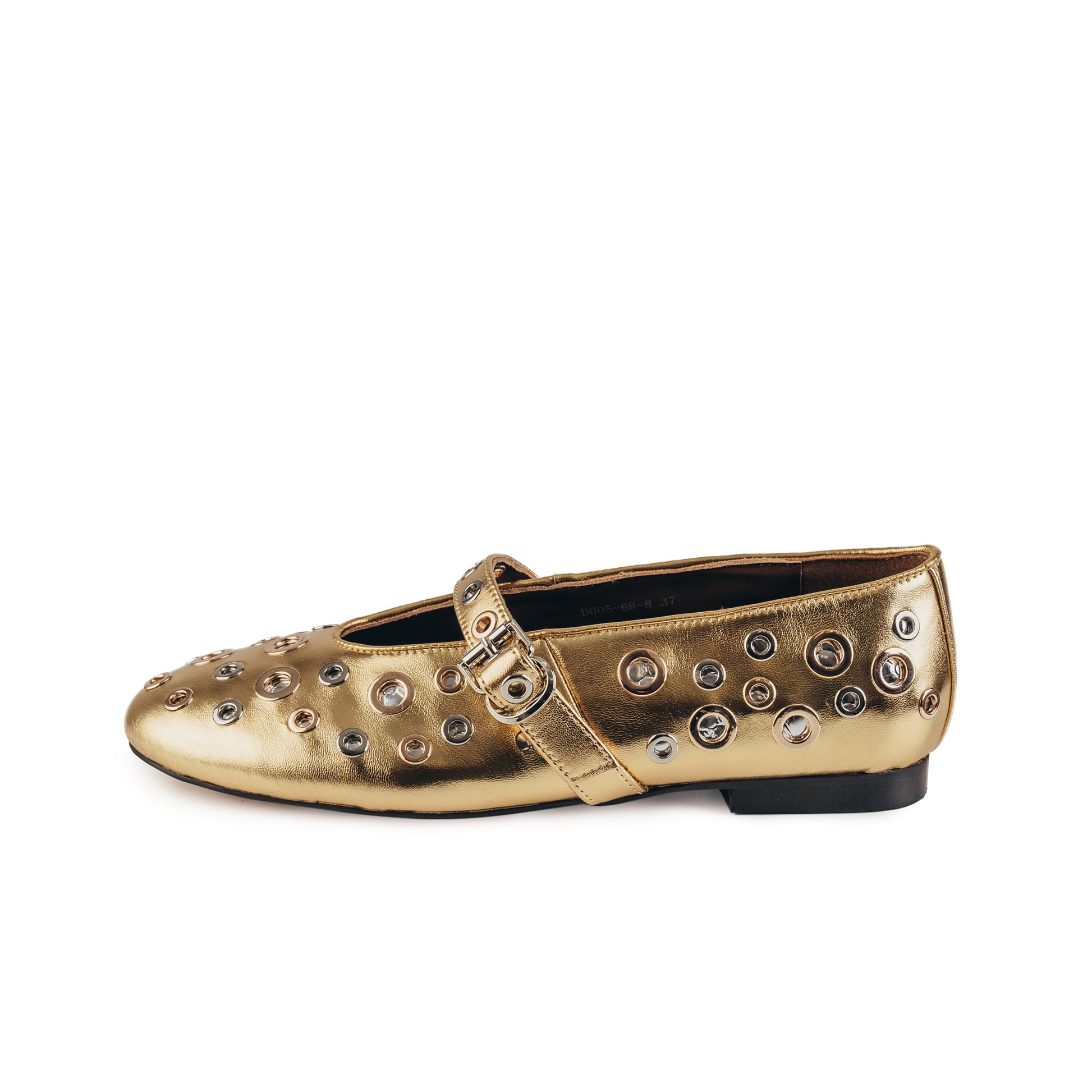Sabrinas em pele dourada e forro em pele castanha. Constituída por ilhós que podem ser dourados ou prateados e são fechados com uma película metalizada em prateado. O conforto é excecional.