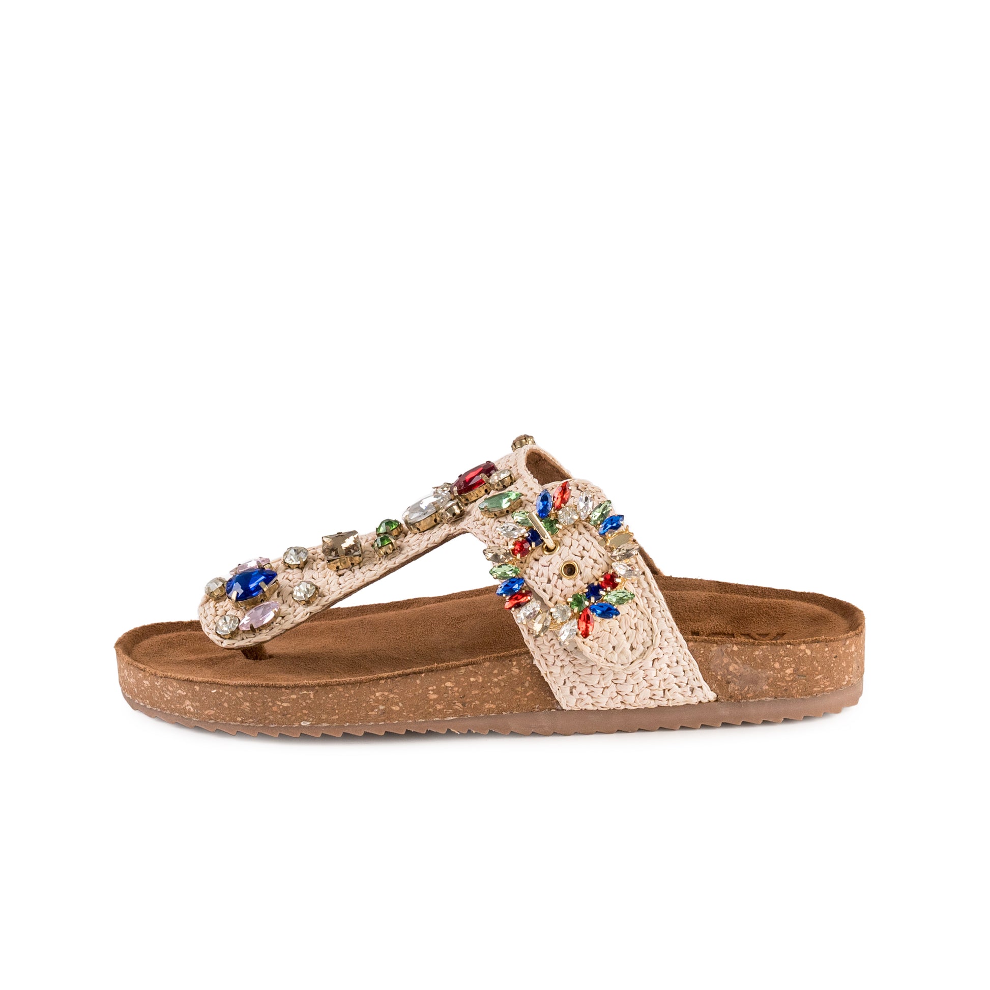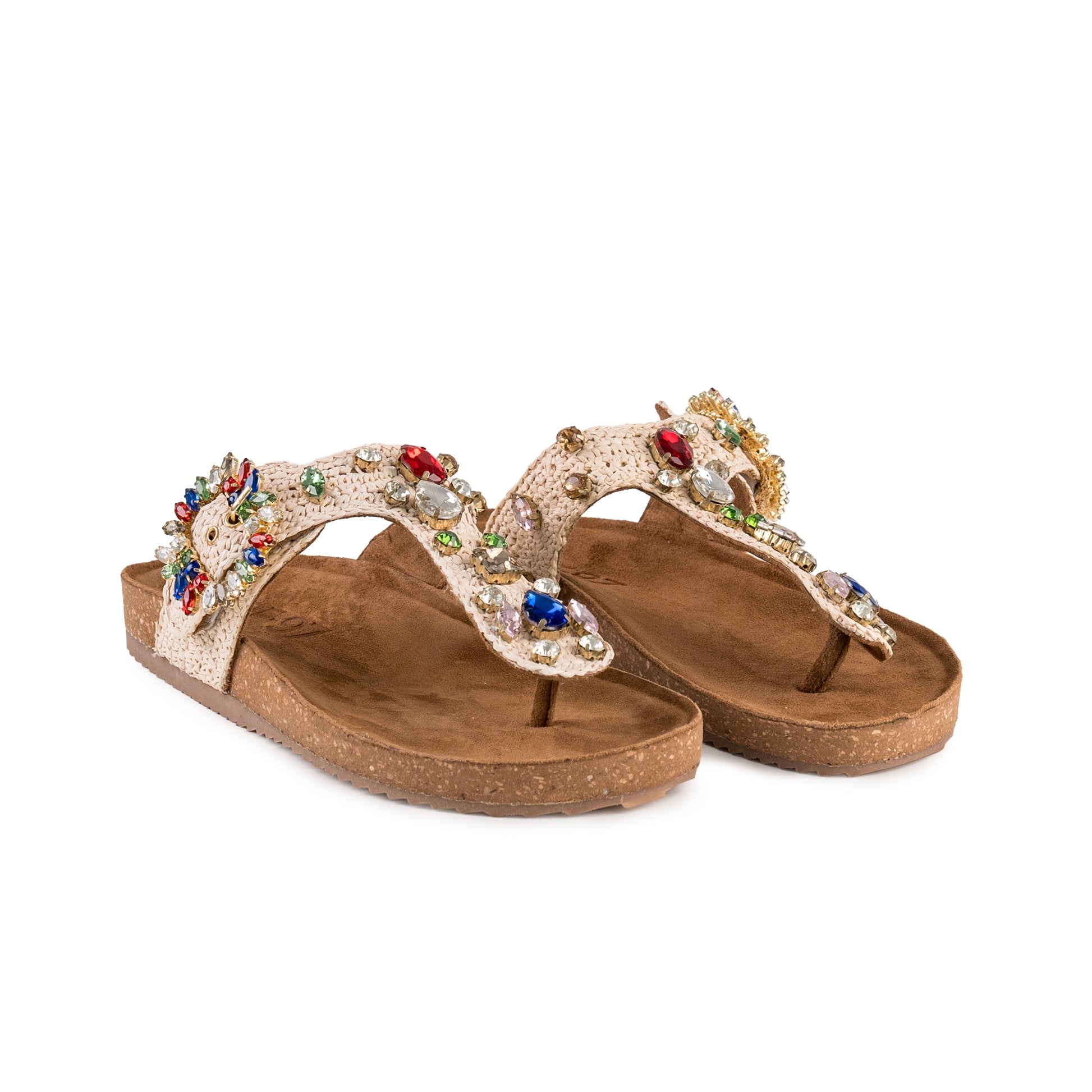 Sandálias em rafia natural com brilhantes multicolor com sola em borracha. Palmilha anatómica e cunha em cortiça.
