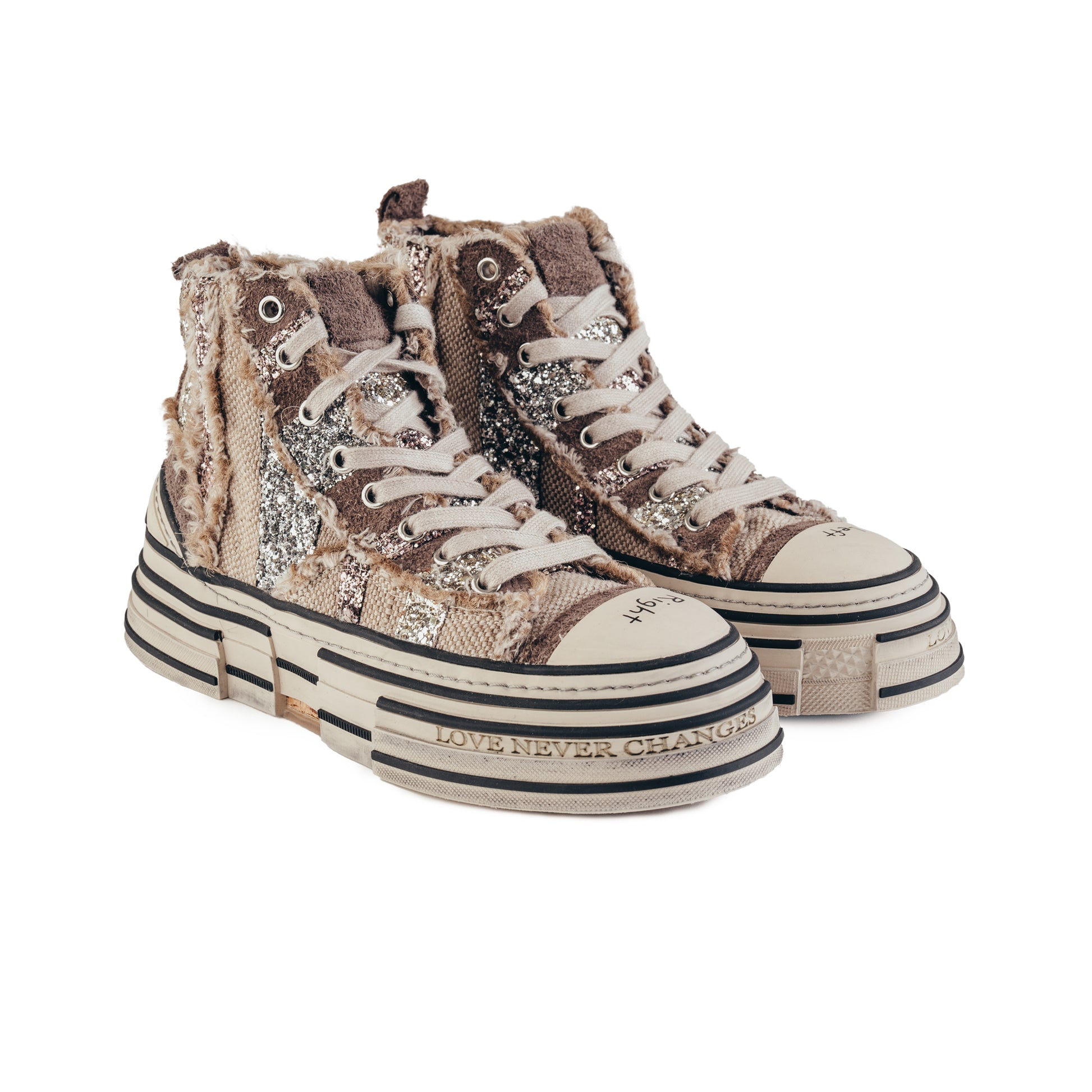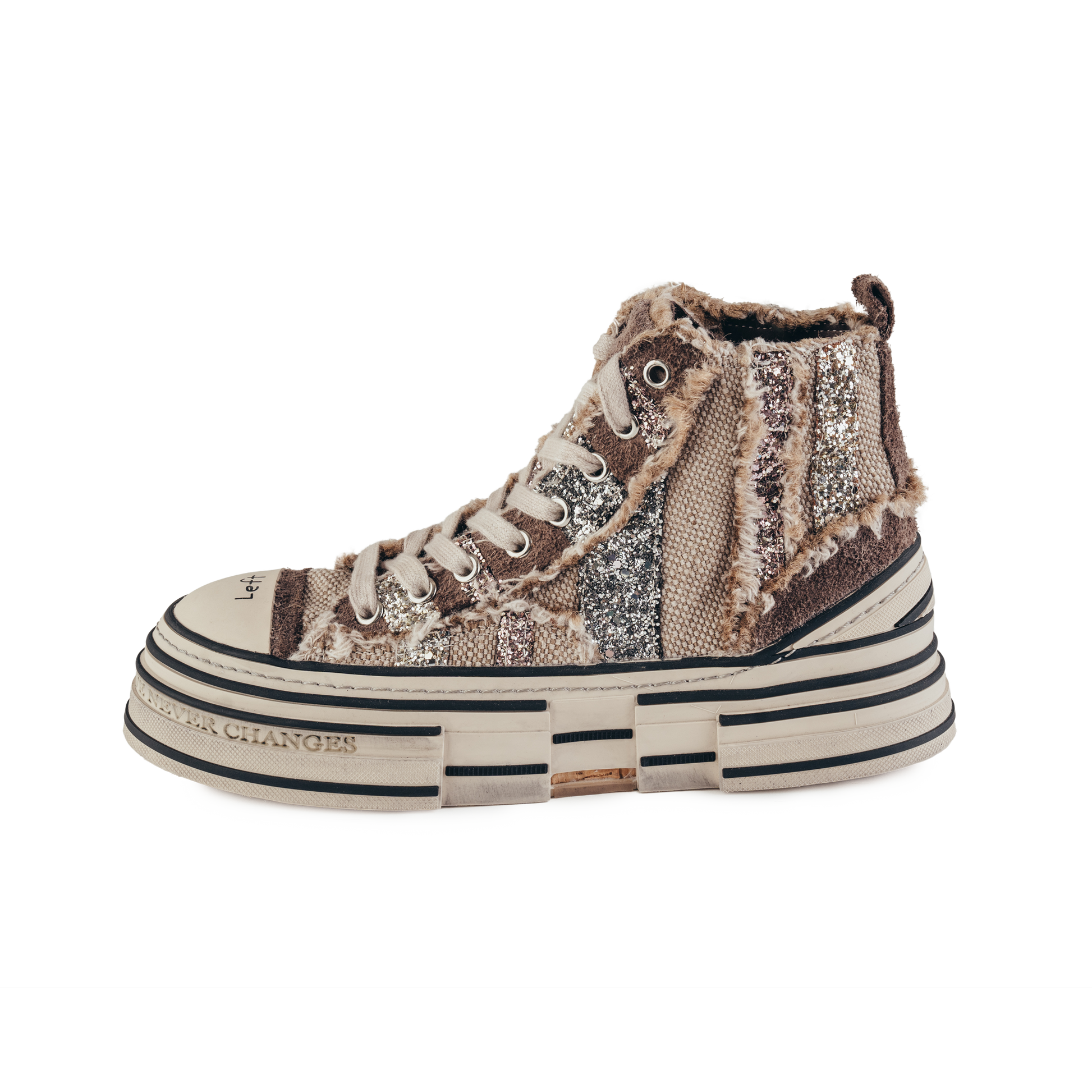 Estas sapatilhas apresentam o exterior em em pele repleta de glitter. O seu forro é 100% em pele para uma maior maleabilidade, conforto e durabilidade. Tem um fecho interior para ajudar a calçar. A sua sola original da nossa marca é de borracha, o que confere antiderrapagem.