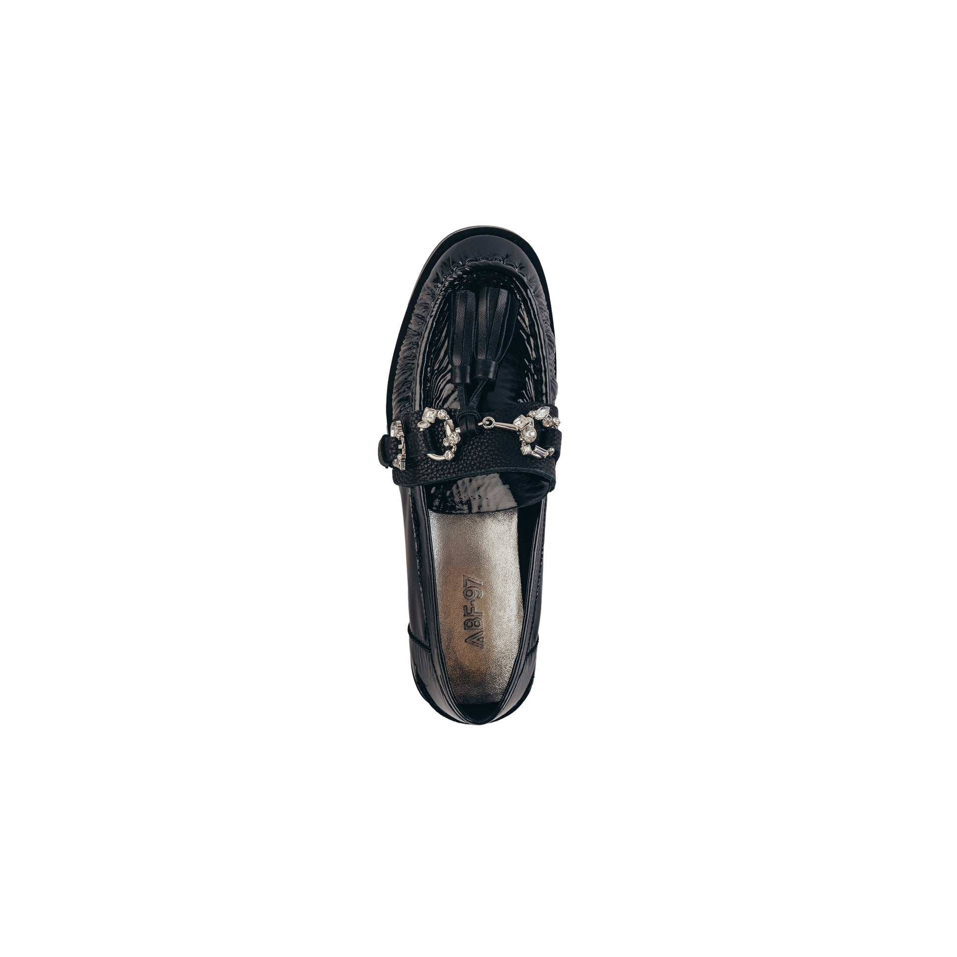 Sapato em preto verniz com sola em borracha e forro em pele. Aplicação composta por brilhantes e berloque em pele.